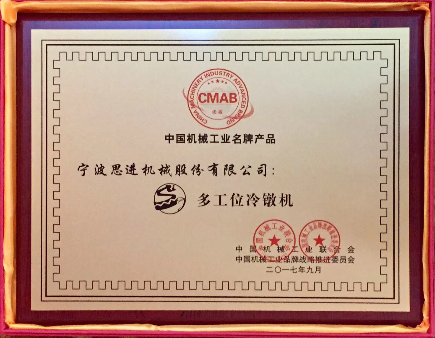 “中國機械工業名牌產品”的獲得需要企業在品牌競爭力、內部管理能力、創新能力、誠信體系、社會責任、企業文化等方面具有突出業績,申報的產品要掌握核心技術,采用先進標準、擁有自主知識產權。獲此殊榮,對今后寧波思進多工位冷鐓機的市場競爭力、品牌推廣及產品質量提升等將起到積極的推動作用。