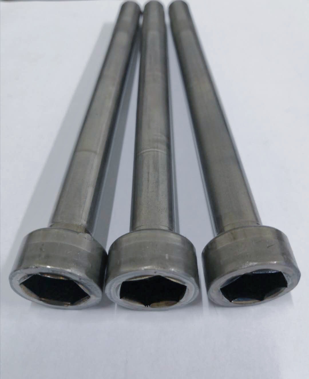 在塑性變形過程中難度最大的就是空心長零件,這也是在冷鐓行業(yè)中眾所周知的難點。在上世紀90年代,受限于冷鐓設(shè)備、線材及熱處理條件,長徑比(桿長與內(nèi)孔直徑的比值)只能達到3-5倍。然而隨著工業(yè)的不斷發(fā)展,目前已經(jīng)達到了8-11倍,這已是全體冷鐓人普遍認為的一個瓶頸。而思進智能為了突破這個瓶頸,在設(shè)備結(jié)構(gòu)以及模具設(shè)計上不斷進行工藝改進,已成功試制出長徑比達16倍的空心長零件,將來還有望達到約20倍,相當于目前大眾水平的整整一倍之多。